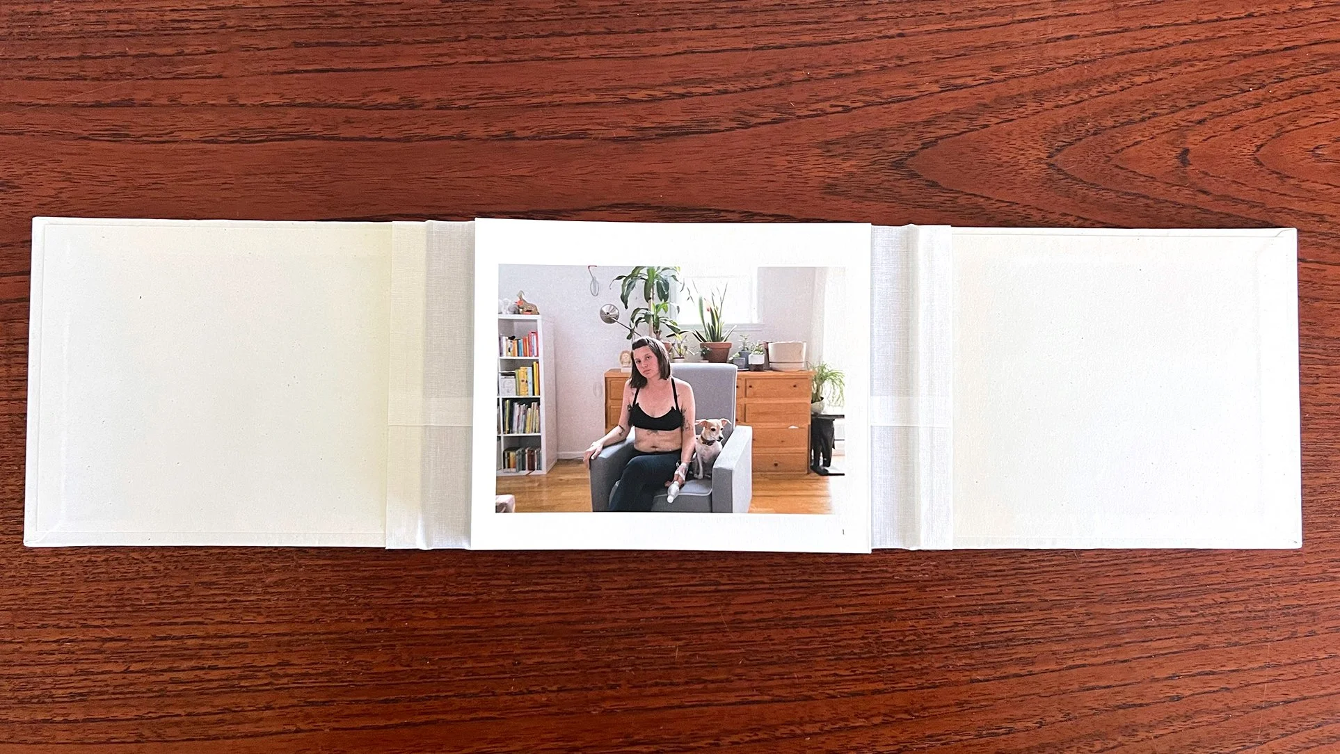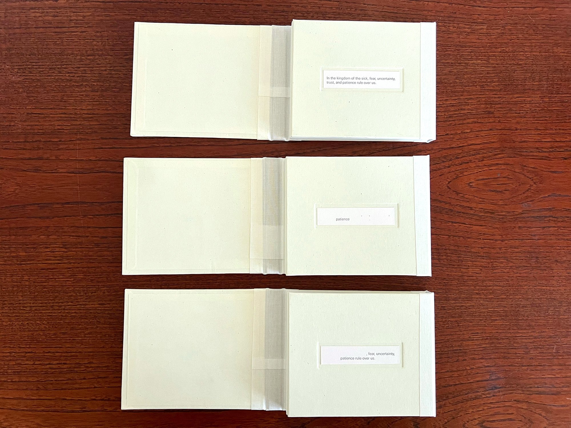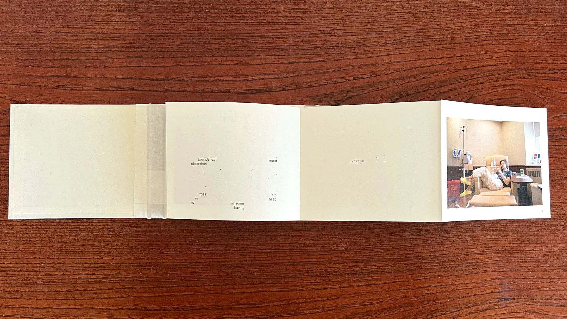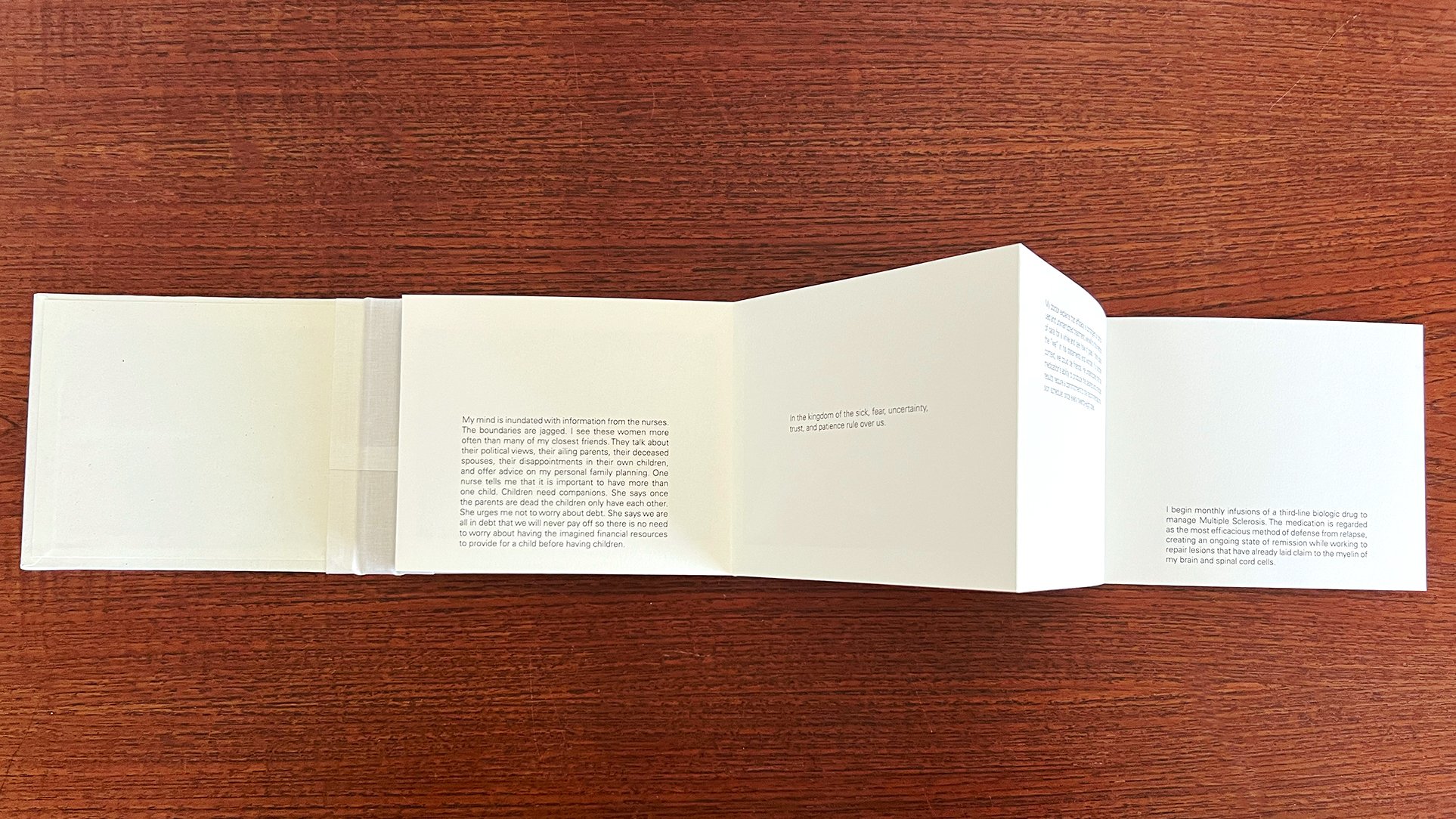 The books transform medicalized time into an opportunity for active choreography with the body, the camera, and the book form itself. I examine the intricacies of photographic selection and choice, asking, what are the parameters of defining the “best” self-portrait in a series that looks at one’s vulnerability, care, and survival? The accompanying text, an excerpt from a longer piece of autobiographical writing about illness, is printed on the verso of each accordion, each with partial erasure as it reappears in each book.